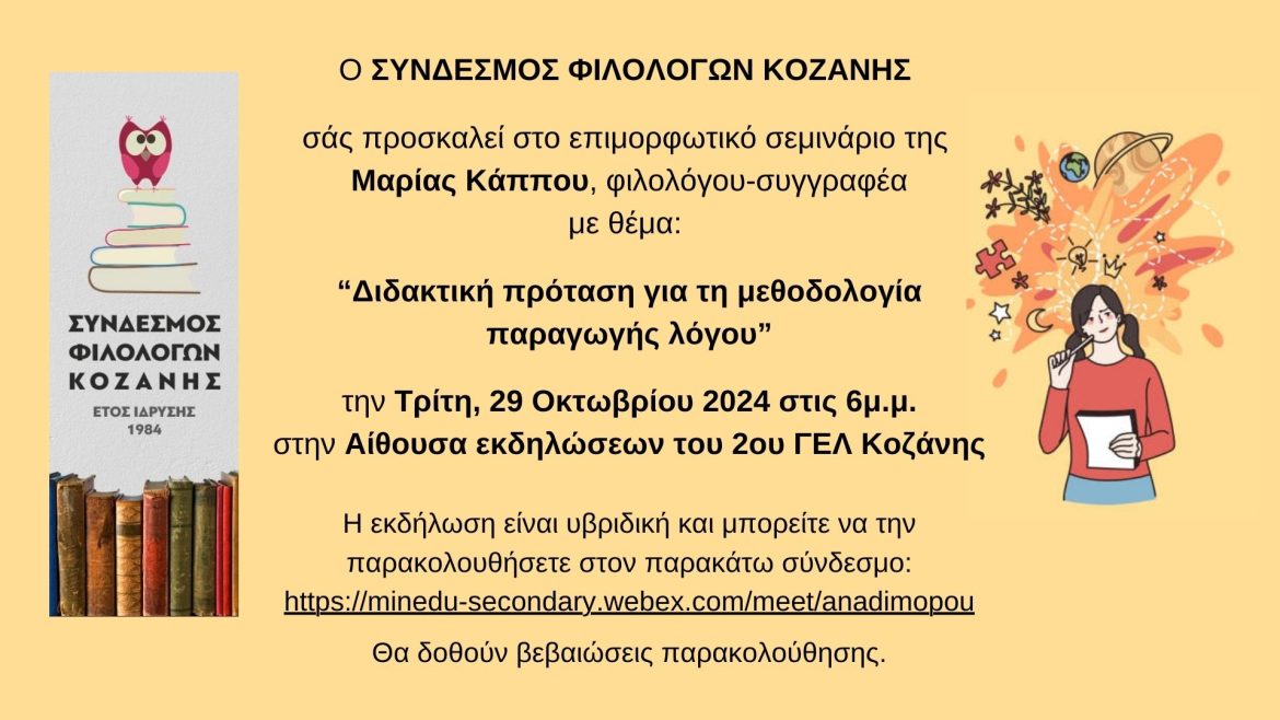 Ο Σύνδεσμος Φιλολόγων Κοζάνης, ανταποκρινόμενος στην ανάγκη για ουσιαστική επιμόρφωση των εκπαιδευτικών διοργανώνει ΕΠΙΜΟΡΦΩΤΙΚΟ ΣΕΜΙΝΑΡΙΟ την Τρίτη 29 Οκτωβρίου στις 18.00 μ.μ. στην αίθουσα εκδηλώσεων του 2ου ΓΕΛ Κοζάνης.