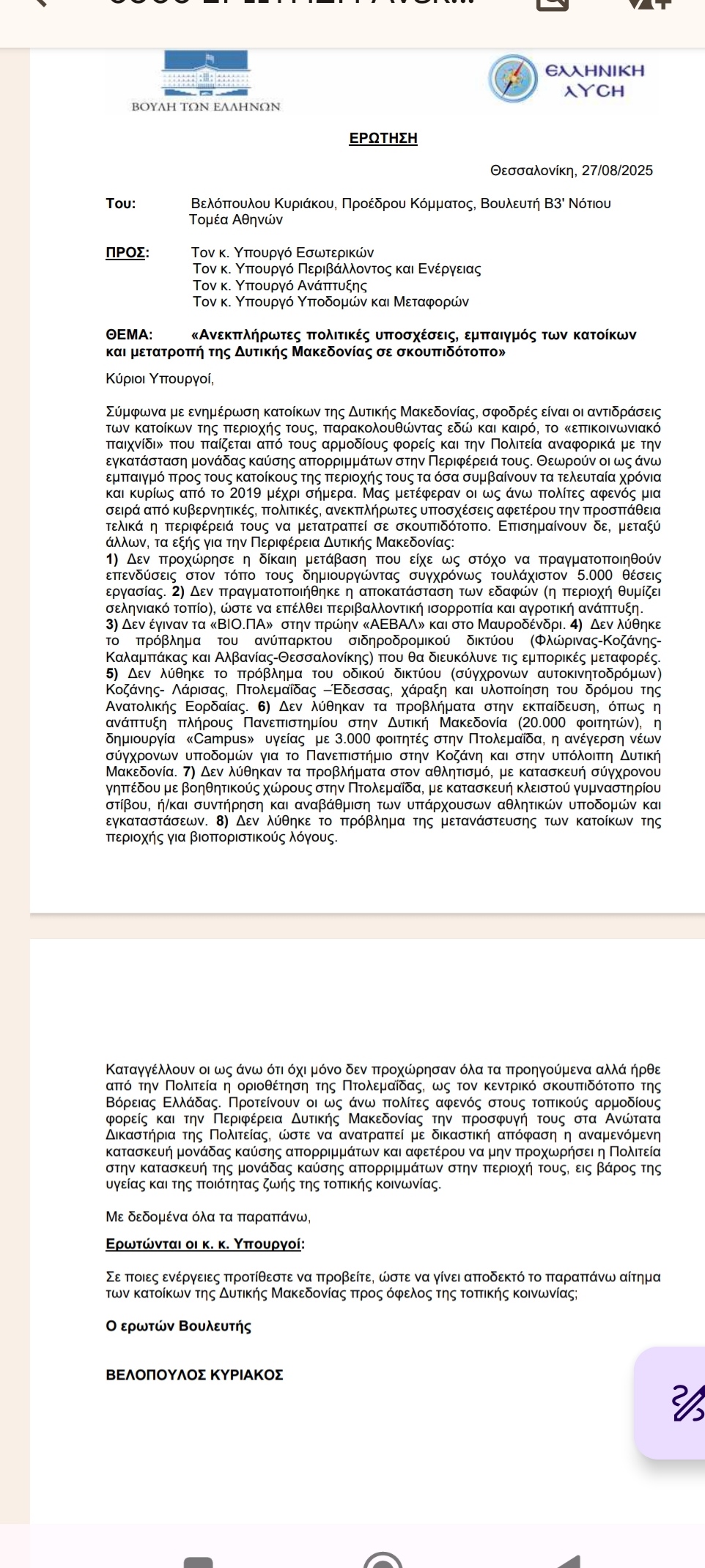 Ερώτηση προς τέσσερις υπουργούς κατέθεσε ο Πρόεδρος της Ελληνικής Λύσης και Βουλευτής Β3’ Νοτίου Τομέα Αθηνών, Κυριάκος Βελόπουλος, σχετικά με τις ανεκπλήρωτες πολιτικές δεσμεύσεις και την πρόθεση εγκατάστασης μονάδας καύσης απορριμμάτων στη Δυτική Μακεδονία.