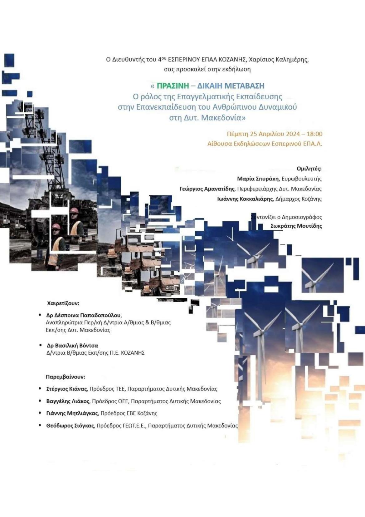 Εσπερίδα του 4ου Εσπερινού ΕΠΑΛ Κοζάνης με θέμα «Πράσινη – Δίκαιη Μετάβαση. Ο ρόλος της Επαγγελματικής Εκπαίδευσης στην επανεκπαίδευση του Ανθρώπινου Δυναμικού στη Δυτ. Μακεδονία»