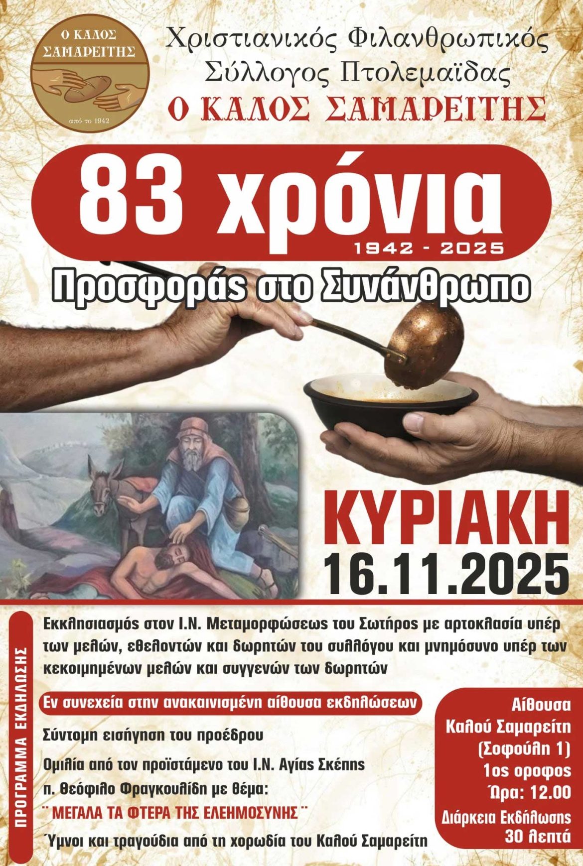 Ετήσια Γιορτή του Χριστιανικού Φιλανθρωπικού Συλλόγου Πτολεμαΐδας “ο Καλός Σαμαρείτης” Κυριακή 16/11/2025. 80 Χρόνια Προσφοράς στον Συνάνθρωπο
