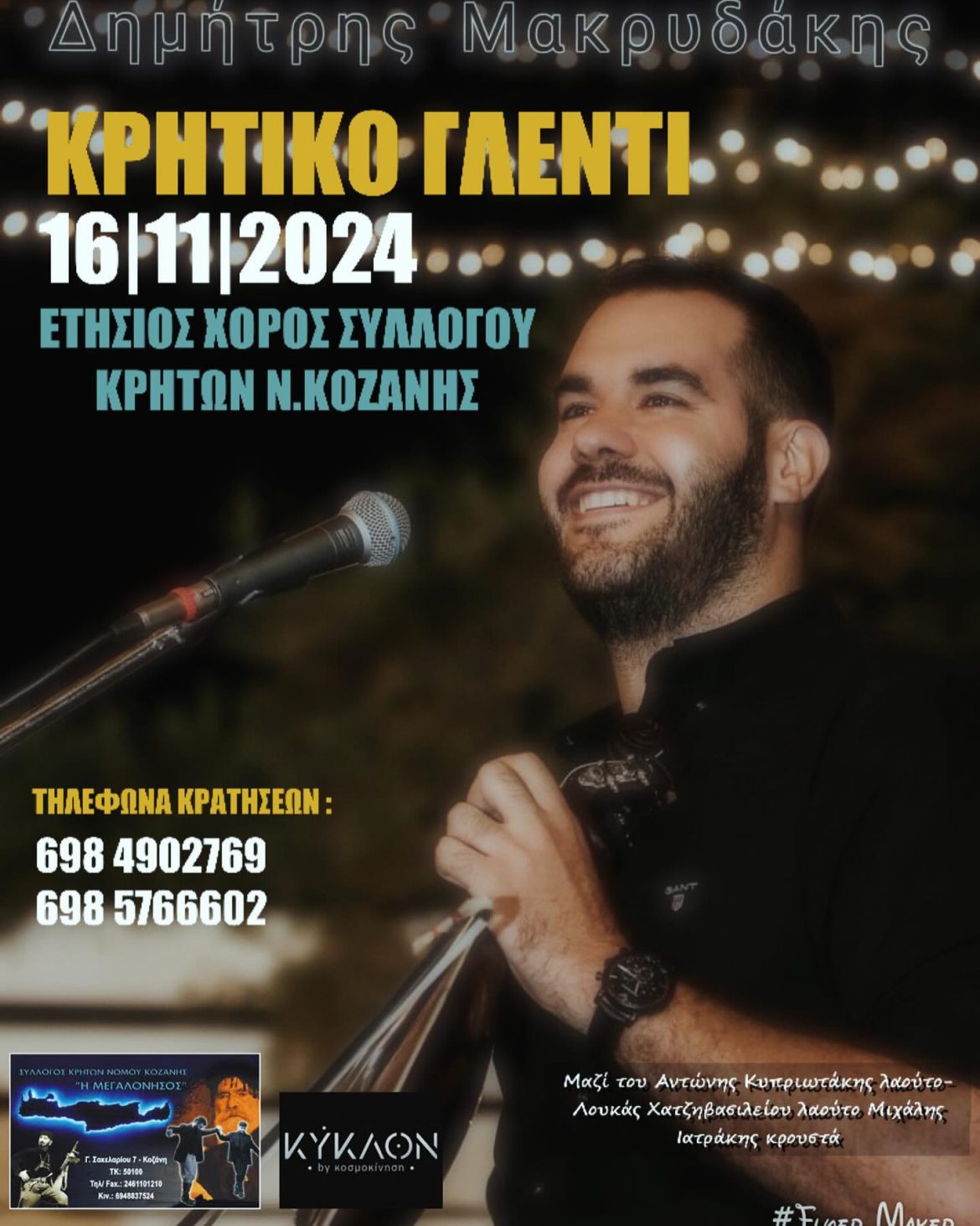 Είμαστε στην ευχάριστη θέση να σας ανακοινώσουμε ότι το Σάββατο 16 Νοεμβρίου 2024 θα πραγματοποιηθεί ο ετήσιος χορός του συλλόγου μας. Το Γλέντι θα γίνει στον χώρο εκδηλώσεων <<Κύκλων>> 1ο χλμ Κοζάνης Αργίλου. Θα μας διασκεδάσει το συγκρότημα του Δημήτρη Μακρυδάκη όπου θα τον πλαισιώσουν οι Κυπριωτάκης Αντώνης, Χατζηβασιλείου Λουκάς στα λαούτα και ο Ιατράκης Μιχάλης στα κρουστά. Σας περιμένουμε να γλεντήσουμε και να χορέψουμε παρέα!