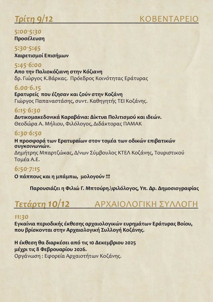Ο Δήμος Βοΐου, σε συνδιοργάνωση με τον Δήμο Κοζάνης, την Τοπική Κοινότητα Εράτυρας και την Εφορεία Αρχαιοτήτων Κοζάνης, πραγματοποιεί τις εκδηλώσεις με τίτλο «Εβδομάδα Εράτυρας στην Κοζάνη», από Τρίτη 9 Δεκεμβρίου έως και Παρασκευή 12 Δεκεμβρίου.