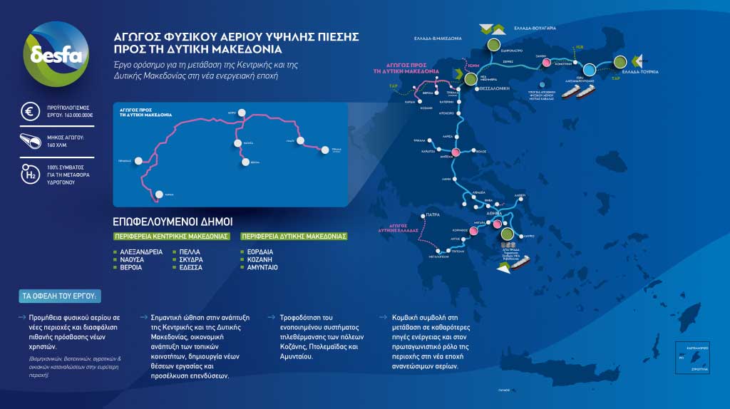 Το ΕΣΠΑ 2021-2027, θα επιχορήγηση την κατασκευή αγωγού Φ.Α. υψηλής πίεσης προς τη Δυτική Μακεδονία, μήκους 157 χιλ. και συνολικού κόστους 188.341.603,94 ευρώ, ενώ η συνολική δημόσια δαπάνη θα είναι 84.311.895 ευρώ. Σύμφωνα με την ανακοίνωση του Αν. ΥΠΕΘΟ κ Παπαθανάση (17-11-2025) είναι ο πρώτος αγωγός υψηλής πίεσης στην Ελλάδα και ένας από τους πρώτους στην Ευρώπη που έχει σχεδιαστεί μελλοντοστραφώς, με δυνατότητα να μεταφέρει έως και 100% υδρογόνο. Το έργο ξεκινά από τα Τρίκαλα Ημαθίας και μαζί με άλλες διακλαδώσεις θα καταλήγει βόρεια της Πτολεμαΐδας.