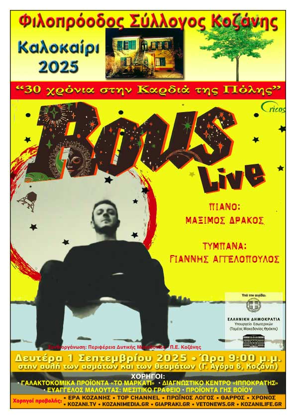 Ο Φιλοπρόοδος Σύλλογος Κοζάνης, μετά την Αυγουστιάτικη μικρή ανάπαυλα, επανέρχεται στη φιλόξενη αυλή, για τον δεύτερο κύκλο των μουσικών εκδηλώσεων του φετινού καλοκαιριού και σας προσκαλεί σε μια μοναδική μουσική παράσταση με τον πολυτάλαντο και πολύ ρομαντικό Γιώργο Ρους.