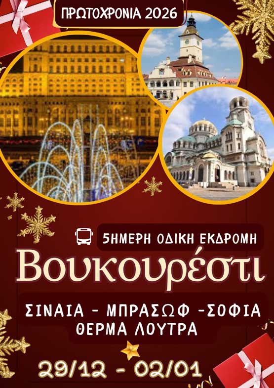 - Στις 13–14 Δεκεμβρίου, η Hermes Tours οργανώνει μια διήμερη οδική εκδρομή στη Σόφια, έναν προορισμό που συνδυάζει χριστουγεννιάτικη ατμόσφαιρα, ιστορικά μνημεία και ευκαιρίες για αγορές.