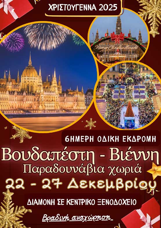 - Για όσους επιθυμούν μεγαλύτερο ταξίδι στην καρδιά της Ευρώπης, το γραφείο διαθέτει 6ήμερη οδική εκδρομή στη Βουδαπέστη και τη Βιέννη, δύο πόλεις που φημίζονται για το εορταστικό τους κλίμα, τις όμορφες αγορές και την αρχιτεκτονική τους.