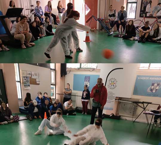 Παράλληλα, είχαμε τη χαρά να φιλοξενήσουμε παιδιά από το ΚΕΚΑμεΑ Κοζάνης. Ο Σύλλογος Γονέων & Κηδεμόνων πρόσφερε χυμούς στους φιλοξενούμενούς μας, ενώ την ώρα που στο γυμναστήριο γινόταν η προσομοίωση του goalball, στο γήπεδο μπάσκετ τα παιδιά του ΚΕΚΑμεΑ έπαιζαν μπάσκετ μαζί με τους μαθητές μας. Η κοινή αυτή δράση γέμισε χαμόγελα και απέδειξε ότι ο αθλητισμός μπορεί να ενώσει όλους τους ανθρώπους, χωρίς διακρίσεις.