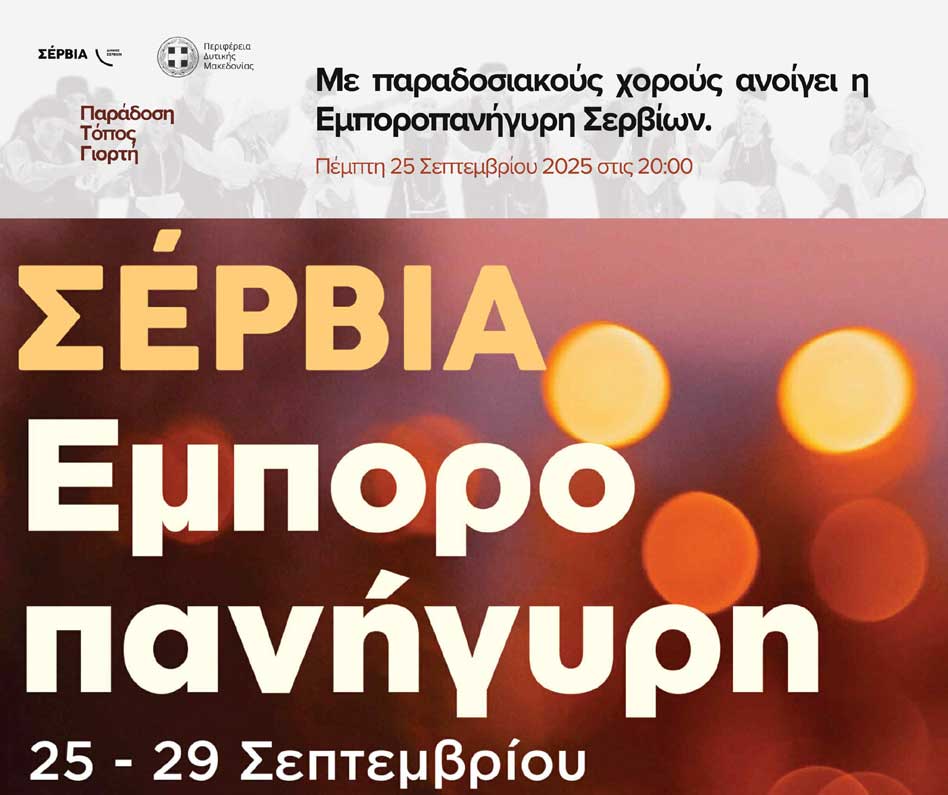 Ο Δήμος Σερβίων ανακοινώνει την έναρξη της Εμποροπανήγυρης Σερβίων την Πέμπτη 25 Σεπτεμβρίου 2025 και ώρα 20:00.