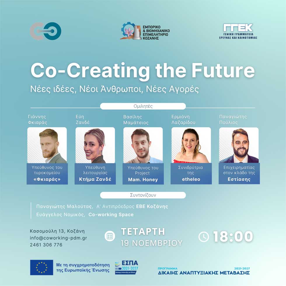 Ο Συνεργατικός Χώρος Εργασίας Δυτικής Μακεδονίας, σε συνεργασία με το Επιμελητήριο Κοζάνης, διοργανώνει την εκδήλωση «Co-Creating the Future: Νέες Ιδέες, Νέοι Άνθρωποι, Νέες Αγορές», μια ανοιχτή συζήτηση με νέους επιχειρηματίες της περιοχής που εκπροσωπούν τη νέα γενιά του τοπικού επιχειρηματικού οικοσυστήματος.
