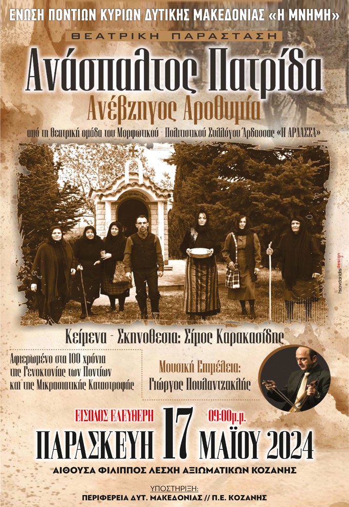 Η θεατρική παράσταση “Ανάσπαλτος Πατρίδα Ανέβζηγος Αροθυμία”, αφιερωμένη για τα 100 χρόνια της Γενοκτονίας των Ποντίων και της Μικρασιατικής Καταστροφής, την Παρασκευή 17 Μαΐου στην Κοζάνη