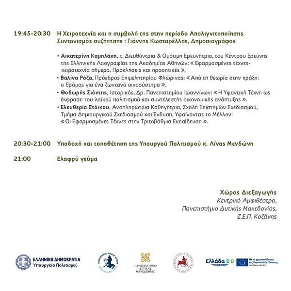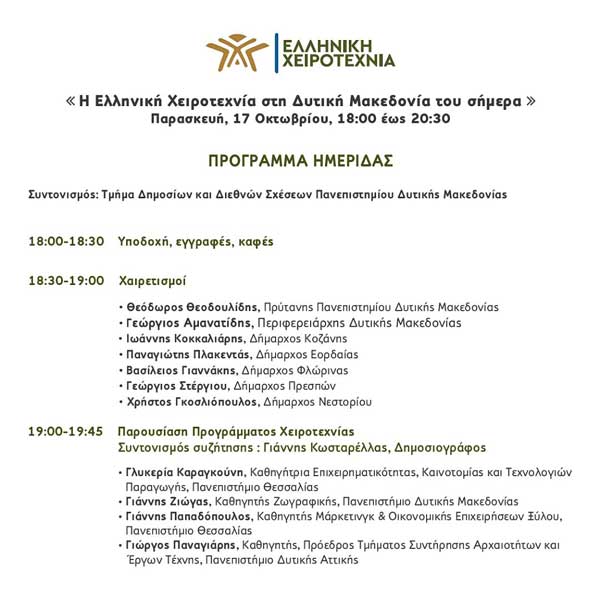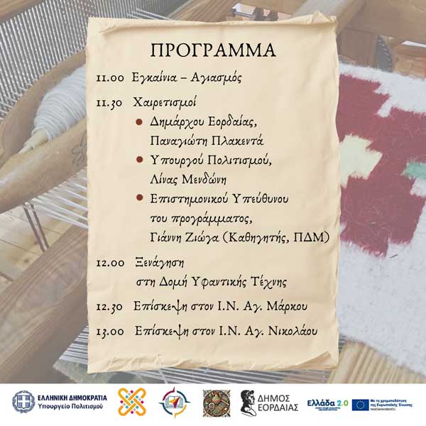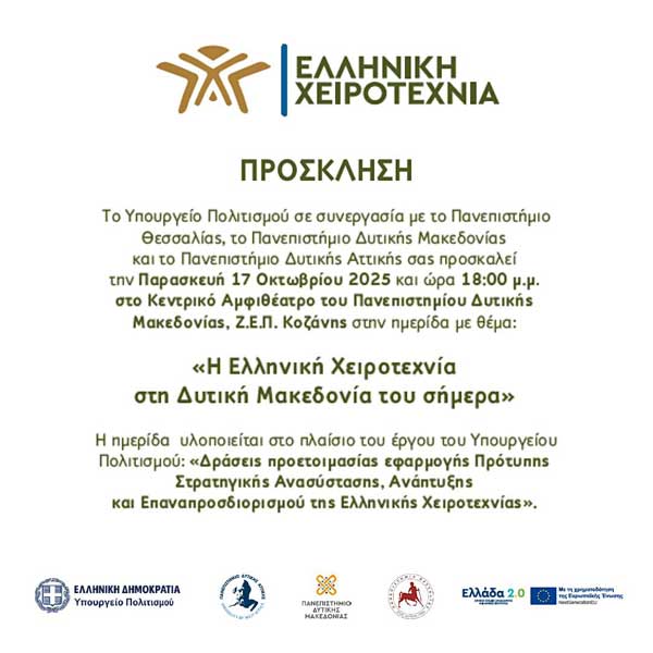 Ημερίδα με θέμα “Η Ελληνική Χειροτεχνία στη Δυτική Μακεδονία του σήμερα” στις 17 Οκτωβρίου 2025, ώρα 18:00 (Κεντρικό Αμφιθέατρο του ΠΔΜ, Ζ.Ε.Π. Κοζάνης) και Εγκαίνια της Δομής Υφαντικής Τέχνης στη Βλάστη του Δήμου Εορδαίας στις 18 Οκτωβρίου 2025, ώρα 11:00.