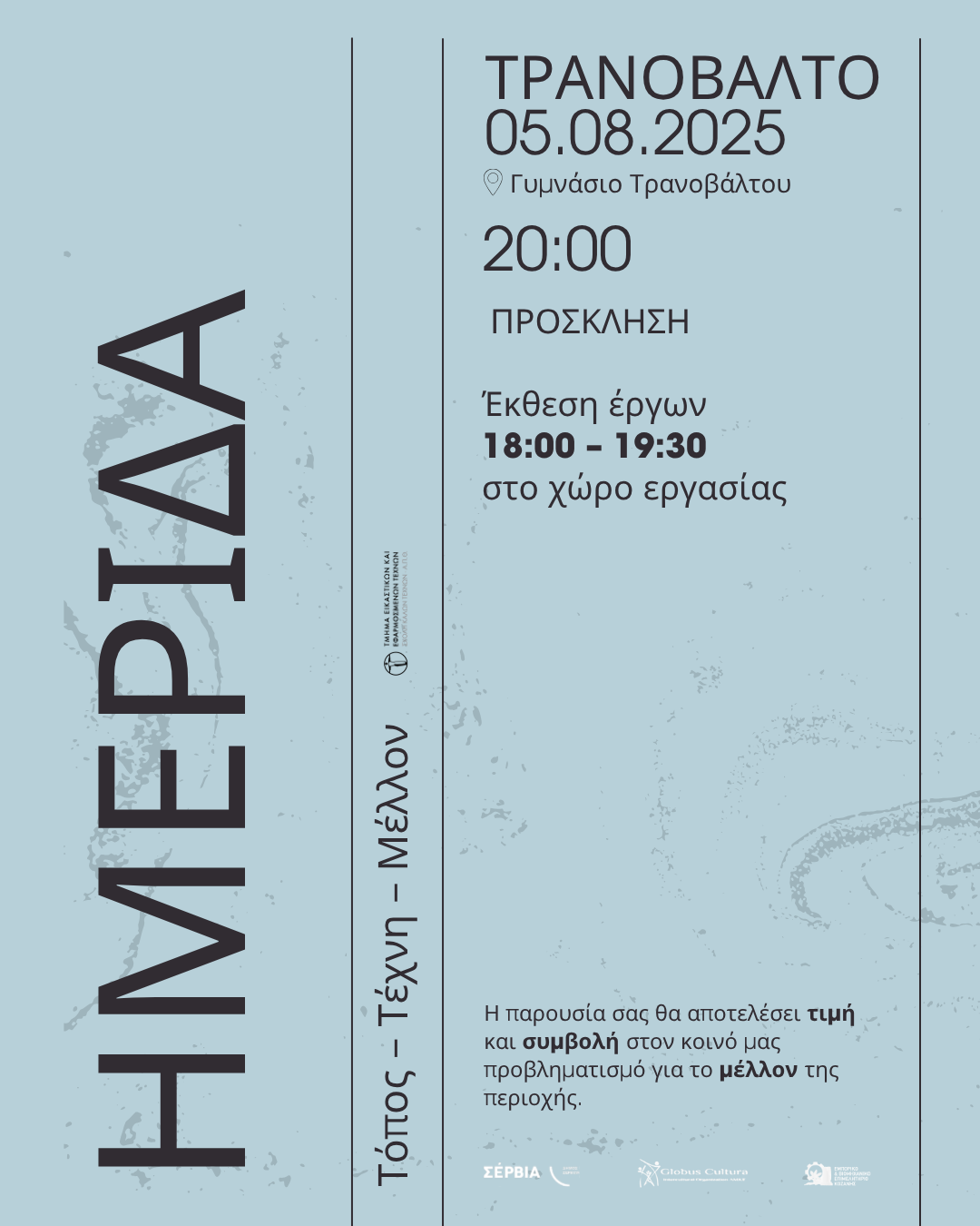 Ο Δήμος Σερβίων σας προσκαλεί στην ημερίδα με τίτλο «Τόπος – Τέχνη – Μέλλον» που θα πραγματοποιηθεί στο Γυμνάσιο Τρανοβάλτου, την Τρίτη 5 Αυγούστου 2025, και ώρα 20:00.