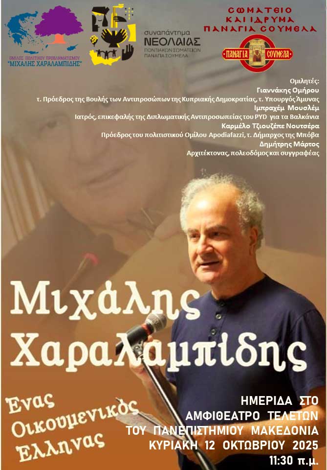 Η ημερίδα θα λάβει χώρα την Κυριακή 12 Οκτωβρίου 2025, στο Αμφιθέατρο Τελετών του Πανεπιστημίου Μακεδονίας, στις 11:30 π.μ. Η είσοδος είναι ελεύθερη. Ο Μιχάλης Χαραλαμπίδης ήταν πολιτικός, κοινωνιολόγος και διανοούμενος. Υπήρξε ιστορικό στέλεχος του ΠΑΣΟΚ και ανήκε στην ομάδα που συνέγραψε την ιδρυτική διακήρυξη του ΠΑΣΟΚ. Ήταν αυτός που έθεσε πρώτος το θέμα της αναγνώρισης της γενοκτονίας του Ποντιακού Ελληνισμού από την Βουλή των Ελλήνων αλλά και την θέσπιση της 19η Μαΐου ως Ημέρα Μνήμης της Γενοκτονίας των Ελλήνων του Πόντου. Πολυγραφότατος, οραματιστής, ιδεολόγος ως το τέλος, δεν έπαψε ποτέ να υπηρετεί τις ιδέες του με συνέπεια. Συχνά παρουσίασε το συγγραφικό του έργο στην φιλόξενη αίθουσα εκδηλώσεων του Σωματείου και του Ιδρύματος «Παναγία Σουμελά». Το Συναπάντημα Νεολαίας Εκπροσώπων Ποντιακών Σωματείων στην Παναγία Σουμελά είχε την τιμή και την χαρά να του ζητήσει να είναι ομιλητής στις εκδηλώσεις του, όπου και με χαρά μοιράστηκε με τις νέες και τους νέους του Συναπαντήματος την εμπειρία, τις θέσεις, τις γνώσεις αλλά και τις σκέψεις του για το αύριο της πατρίδας. Ο Όμιλος Πολιτικού Προβληματισμού «Μιχάλης Χαραλαμπίδης» που συνδιοργανώνει την εκδήλωση, έχει συσταθεί από συνεργάτες του και με πυξίδα τις αρχές και τις ιδέες του, στοχεύει να αναδείξει επίκαιρα θέματα που απασχολούν την ελληνική κοινωνία.