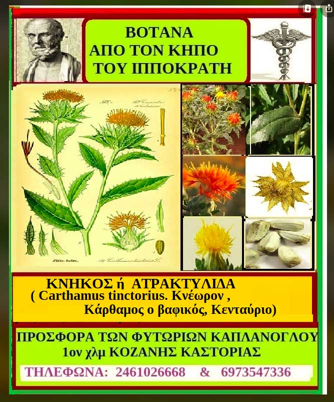 ΚΝΗΚΟΣ ή ΑΤΡΑΚΤΥΛΙΔΑ (Carthamus tinctorius. Κνέωρον, Κάρθαμος ο βαφικός, Κενταύριο). * ΦΥΤΑ ΑΠΟ ΤΟΝ ΚΗΠΟ ΤΟΥ ΙΠΠΟΚΡΑΤΗ * Μάρθα Στ. Καπλάνογλου Γεωπόνος – ΙστορικόςΕλληνικού πολιτισμού.