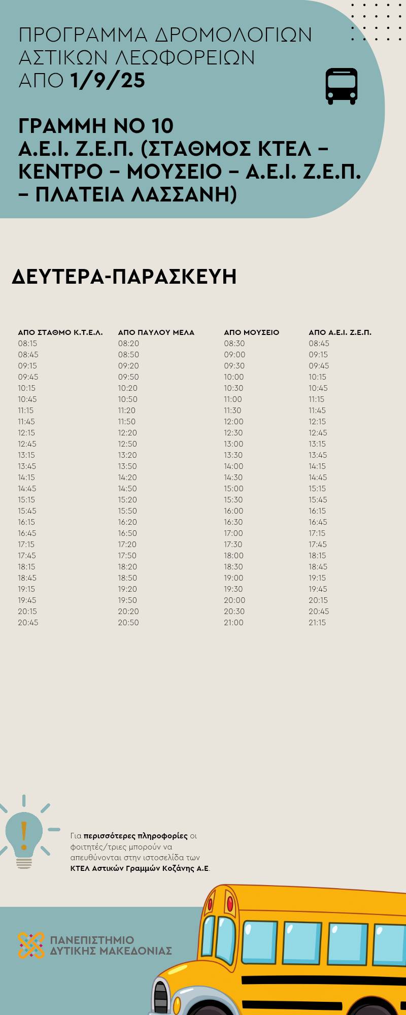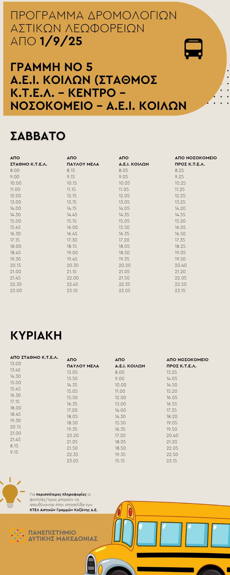 Για περισσότερες πληροφορίες οι φοιτητές/τριες μπορούν να απευθύνονται στην ιστοσελίδα των ΚΤΕΛ Αστικών Γραμμών Κοζάνης Α.Ε. https://astikoktelkozanis.gr/dromologia/.