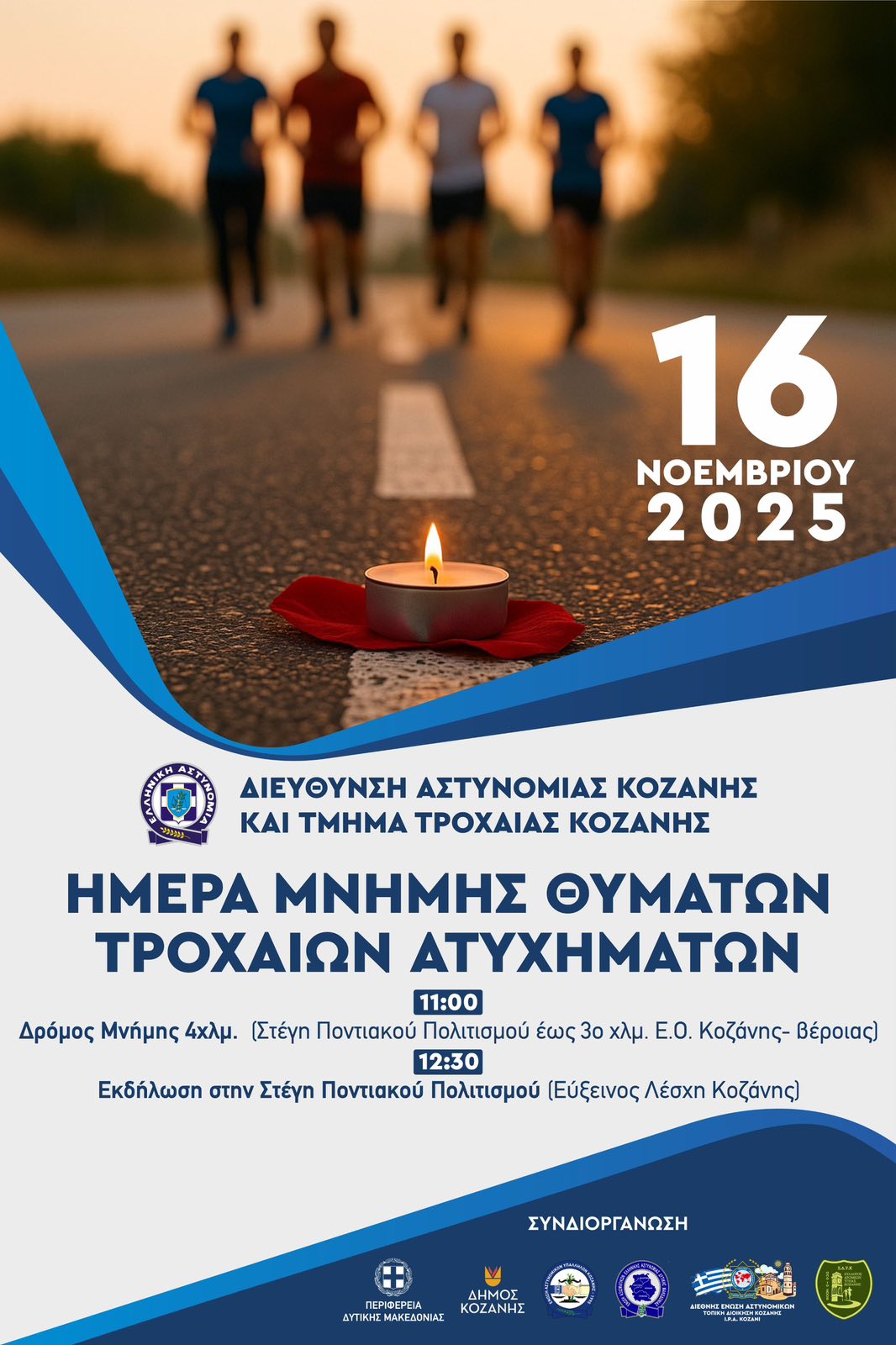 Η Διεύθυνση Αστυνομίας Κοζάνης και το Τμήμα Τροχαίας Κοζάνης, με αφορμή την «Παγκόσμια Ημέρα Μνήμης για τα Θύματα Τροχαίων Ατυχημάτων», θα πραγματοποιήσουν Δρόμο Μνήμης τιμώντας τη μνήμη όσων έχασαν την ζωή τους από Τροχαία ατυχήματα, ενώ θα ακολουθήσει εκδήλωση στην Στέγη Ποντιακού Πολιτισμού στην πόλη της Κοζάνης, με τίτλο «Δρόμοι Ασφαλείς για όλους».
