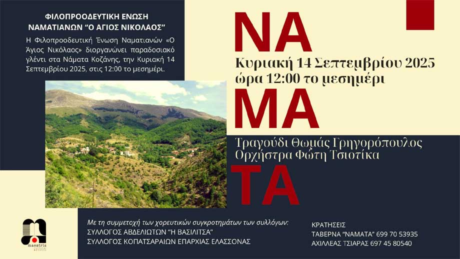 Η Φιλοπροοδευτική Ένωση Ναματιανών «Ο Άγιος Νικόλαος» διοργανώνει ένα μεγάλο παραδοσιακό γλέντι την Κυριακή 14 Σεπτεμβρίου 2025, στις 12:00 το μεσημέρι, στα Νάματα Κοζάνης.