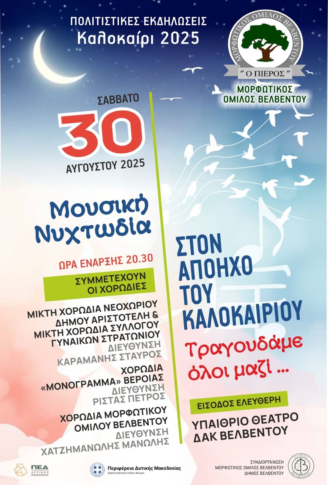 Το καλοκαίρι πλησιάζει στο τέλος του και το αποχαιρετούμε μελωδικά.Η χορωδία του ΜΟΡΦΩΤΙΚΟΎ ΟΜΊΛΟΥ ΒΕΛΒΕΝΤΟΎ, παρέα με τους φίλους μας από το Νεοχώρι του Δήμου Αριστοτέλη και το Στρατώνι με μαέστρο τον ΚΑΡΑΜΑΝΗ ΣΤΑΥΡΌ, μαζί με τους φίλους από την Βέροια και την μικτή χορωδία ΜΟΝΟΓΡΑΜΜΑ με μαέστρο τον ΡΙΣΤΑ ΠΕΤΡΟ θα ντύσουμε μελωδικά το τελευταίο Σαββατόβραδο του Αυγούστου στο θεατράκι του ΔΑΚ ΒΕΛΒΕΝΤΟΥ.