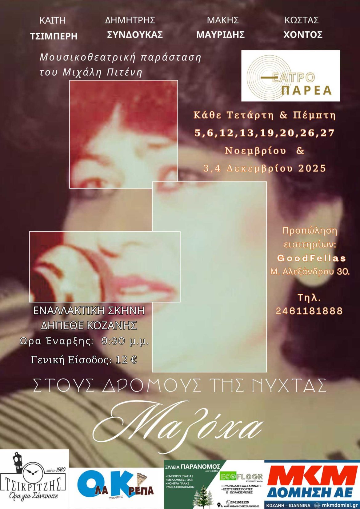 Μια ξεχωριστή μουσικοθεατρική εμπειρία έρχεται στην Κοζάνη με την παράσταση «Στους δρόμους της νύχτας – Μαζόχα», σε κείμενα και σκηνοθεσία του Μιχάλη Πιτένη.