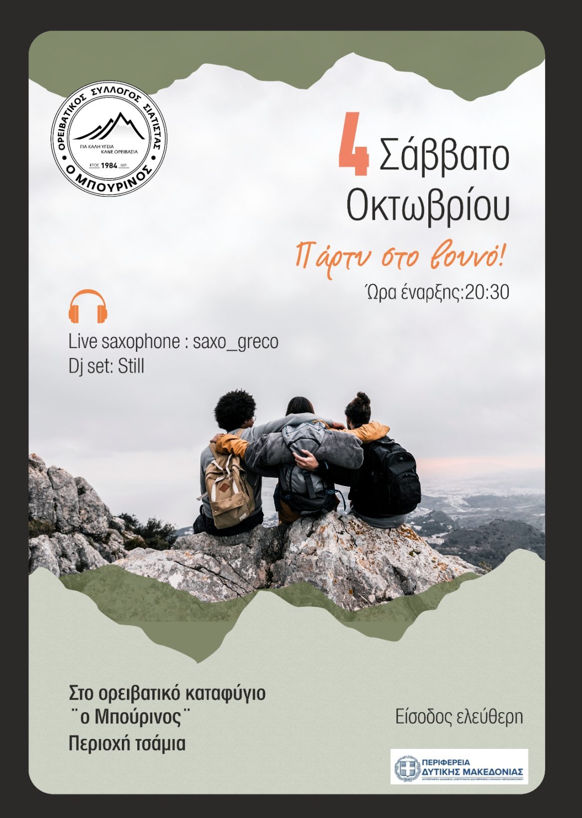 Ο Ορειβατικός Σύλλογος Σιάτιστας “Ο Μπούρινος”, διοργανώνει, με την αρωγή της Περιφερειακής Ενότητας Κοζάνης, μουσική βραδιά, το Σάββατο 4/10/2025 στο καταφύγιο στο Μπούρινο, στις 8:30 μ.μ..