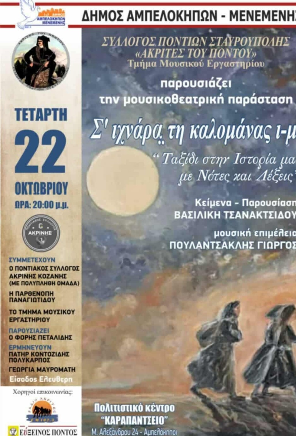 Ο Δήμος Αμπελοκήπων-Μενεμένης και η Αντιδημαρχία Πολιτισμού σε συνεργασία με το Τμήμα Μουσικού Εργαστηρίου του Συλλόγου Ποντίων Σταυρούπολης «Ακρίτες του Πόντου» και με τη συμμετοχή του Ποντιακού Συλλόγου Ακρινής Κοζάνης διοργανώνει την Μουσικό-θεατρική Παράσταση -Αφιέρωμα με τίτλο: “Σ’ ιχνάρα̤ τη καλομάνας ι-μ’ “, την Τέταρτη 22 Οκτωβρίου 2025 στις 20:00 στο ” Πολιτιστικό Κέντρο ”ΚΑΡΑΠΑΝΤΖΕΙΟ”(ΘΕΑΤΡΟ ΣΟΦΙΑΣ ΒΕΜΠΟ), οδός Μ.Αλεξάνδρου 24 -Αμπελόκηποι Θεσσαλονίκης .