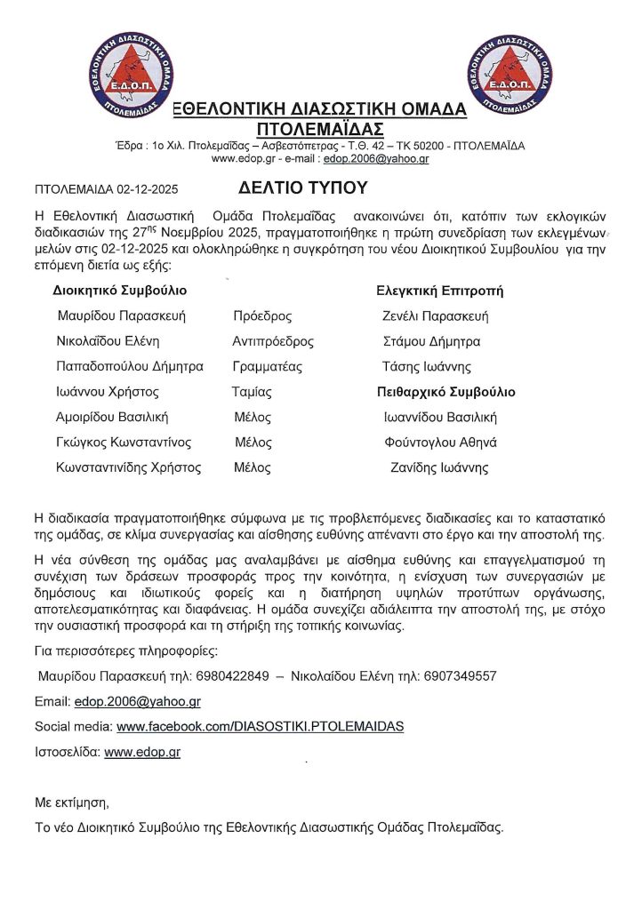 Νέο ΔΣ της Εθελοντικής Διασωστικής Ομάδας Πτολεμαΐδας. Πρόεδρος η Μαυρίδου Παρασκευή