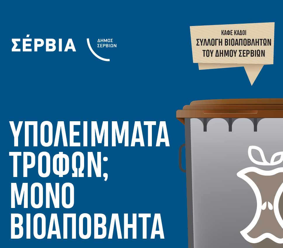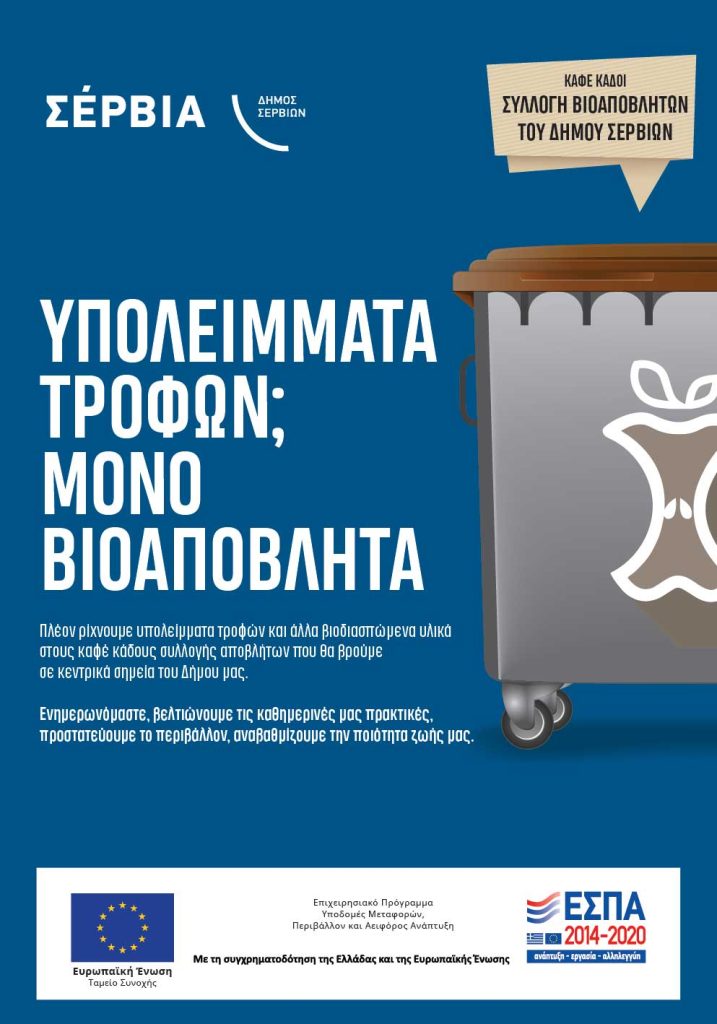 Με επιτυχία ολοκληρώθηκε η Πράξη «Συλλογή βιοαποβλήτων του Δήμου Σερβίων», με συνολική δημόσια δαπάνη 217.160 ευρώ, στο πλαίσιο του Επιχειρησιακού Προγράμματος «Υποδομές Μεταφορών, Περιβάλλον και Αειφόρος Ανάπτυξη 2014-2020». Το έργο χρηματοδοτήθηκε από το Ταμείο Συνοχής και υλοποιήθηκε υπό την εποπτεία της Περιφέρειας Δυτικής Μακεδονίας και της Ειδικής Υπηρεσίας Διαχείρισης του αντίστοιχου προγράμματος.