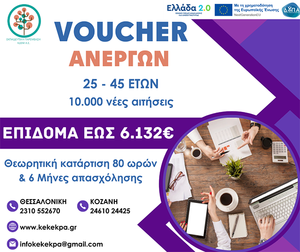 | Νέο VOUCHER ανέργων 25-45. Κατάρτιση + Απασχόληση. Επίδομα 400€ + 6.132€ |