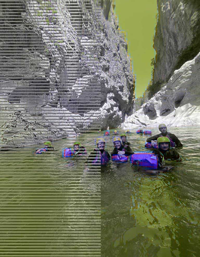 Περίπου 50 λεπτά μετά αφήνουμε το βαν και ξεκινάμε να περπατάμε σε παλιό χωματόδρομο, όπου σύντομα γίνεται κατηφορικό μονοπάτι για να μας οδηγήσει στο σημείο Ντροχαλο (30-40 λεπτά πεζοπορία). Εδώ θα κάνουμε μια στάση για να φορέσουμε με τον εξοπλισμό που έχει δοθεί στον κάθε ένα. Θα έχουμε μια ενημέρωση δέκα λεπτών για το πώς κινούμαστε στο ποτάμι και στις όχθες και η περιπέτεια θα αρχίσει!