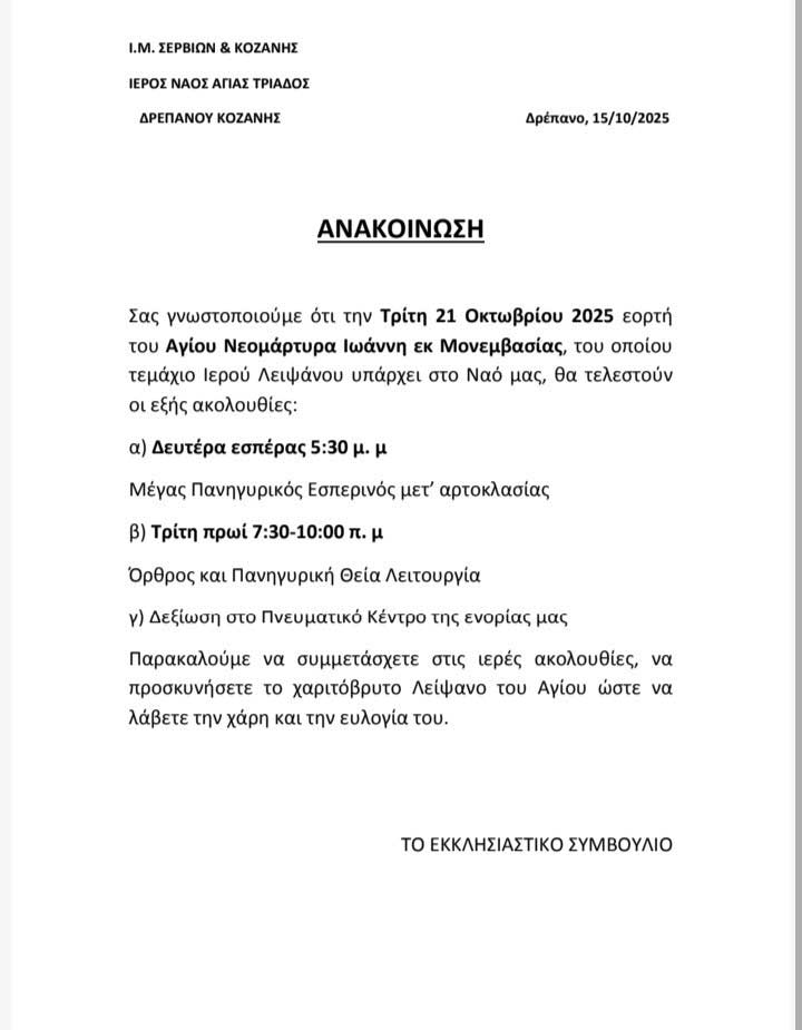 Ο Ι.Ν. Αγίας Τριάδος Δρεπάνου τιμά τον Άγιο Νεομάρτυρα Ιωάννη εκ Μονεμβασίας, του οποίου Ιερό Λείψανο φυλάσσεται στο ναό