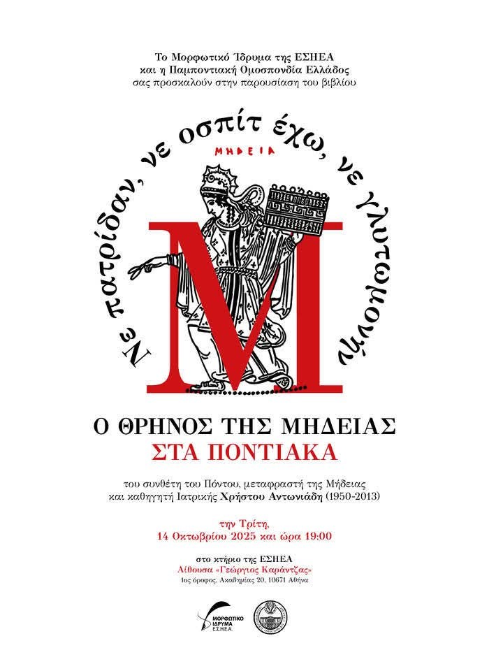 Το Μορφωτικό Ίδρυμα της ΕΣΗΕΑ και η Παμποντιακή Ομοσπονδία Ελλάδος πραγματοποιούν παρουσίαση του βιβλίου του αείμνηστου συνθέτη του Πόντου, μεταφραστή της Μήδειας και καθηγητή Ιατρικής Χρήστου Αντωνιάδη (1950–2013), με καταγωγή από την Ξηρολίμνη Κοζάνης, με τίτλο «Ο Θρήνος της Μήδειας στα Ποντιακά»