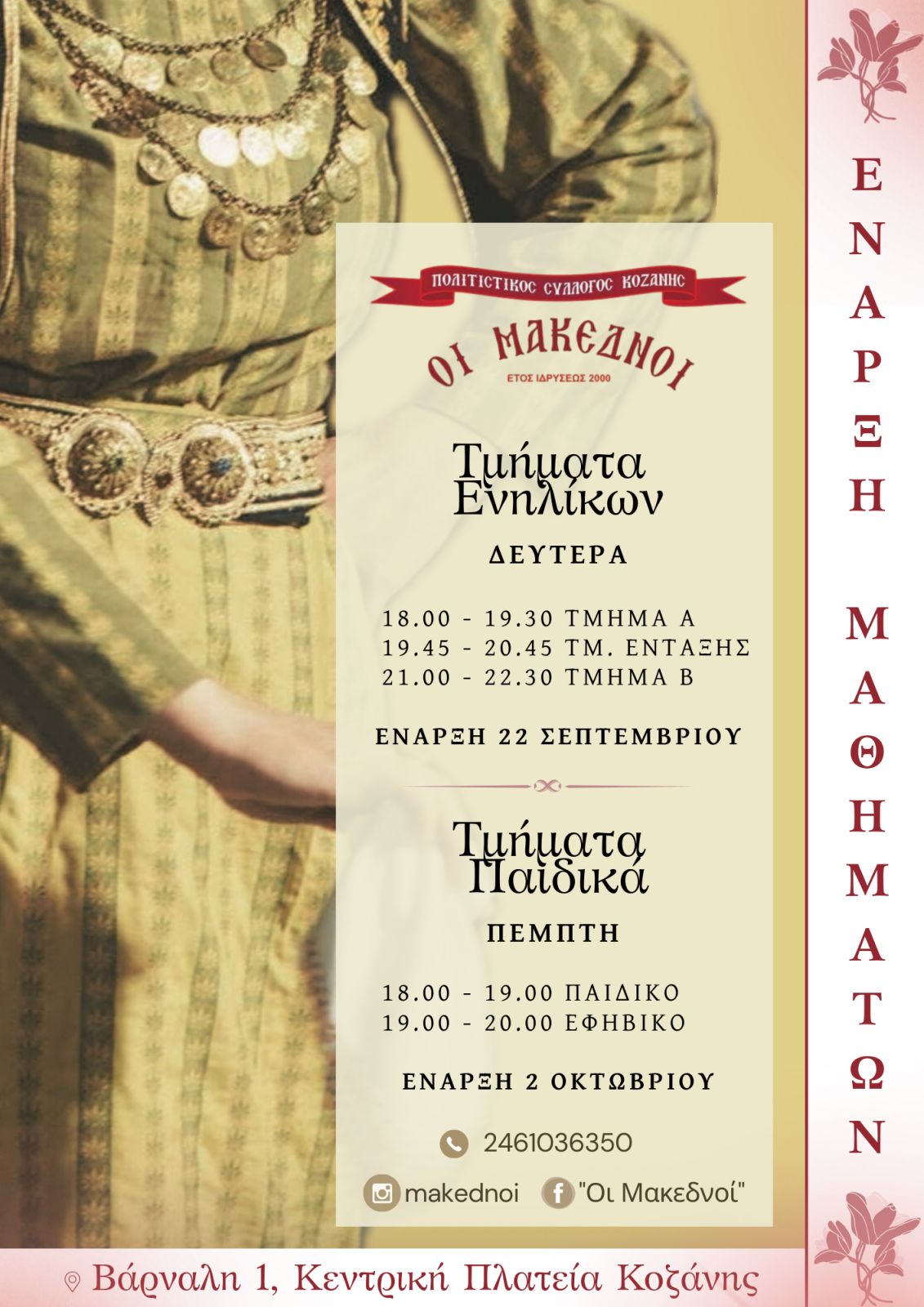 Τη Δευτέρα 22 Σεπτεμβρίου ξεκινούν τα μαθήματα των χορευτικών τμημάτων ενηλίκων του Πολιτιστικού Συλλόγου Κοζάνης «Οι Μακεδνοί», ενώ την Πέμπτη 02 Οκτωβρίου τα παιδικά τμήματα.
