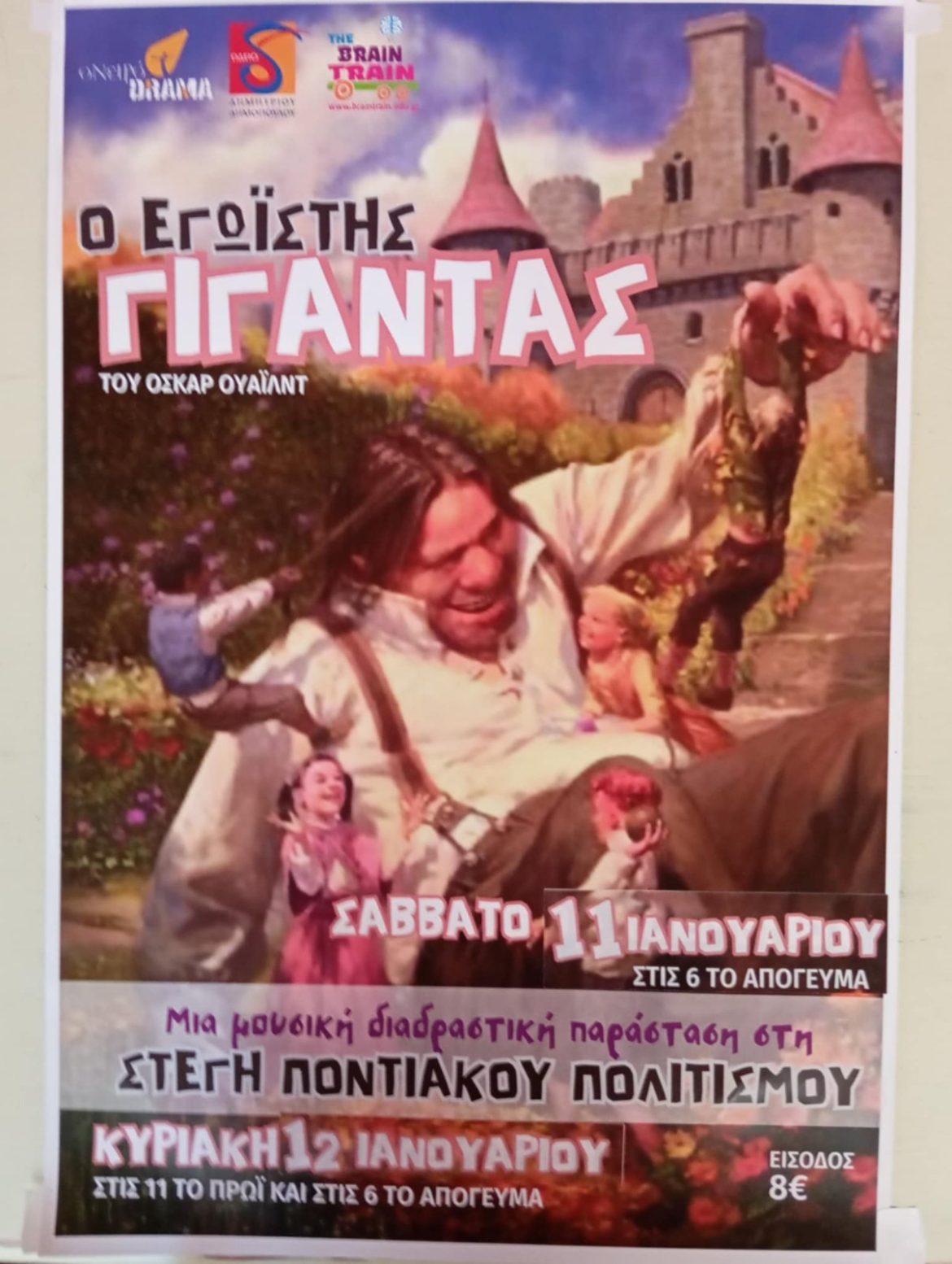 Το Ονειρόdrama σε συνεργασία με το Ωδείο Δημόπουλου και το ΚΔΑΠ The brain train παρουσιάζει τη μουσική διαδραστική παράσταση «Ο εγωιστής γίγαντας» του Όσκαρ Γουάιλντ. Μια παράσταση για παιδιά αλλά και όλους όσοι κρατούν ζωντανό το παιδί μέσα τους.