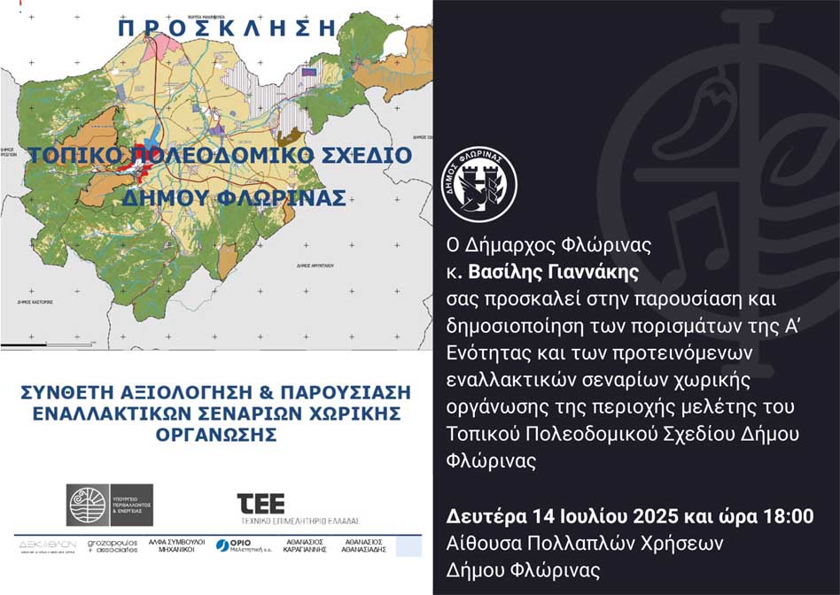 Ο Δήμαρχος Φλώρινας κ. Βασίλης Γιαννάκης, σας προσκαλεί στην παρουσίαση και δημοσιοποίηση των πορισμάτων της Α’ Ενότητας και των προτεινόμενων εναλλακτικών σεναρίων χωρικής οργάνωσης της περιοχής μελέτης του Τοπικού Πολεοδομικού Σχεδίου Δήμου Φλώρινας, τη Δευτέρα 14 Ιουλίου 2025 και ώρα 18:00, στην αίθουσα πολλαπλών χρήσεων Δήμου Φλώρινας, στο Νέο Δημοτικό Πάρκο.