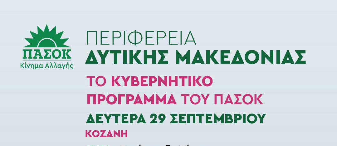 Τη Δευτέρα 29 Σεπτεμβρίου 2025, το ΠΑΣΟΚ – Κίνημα Αλλαγής παρουσιάζει το Κυβερνητικό του Πρόγραμμα στη Δυτική Μακεδονία, με εκδήλωση που θα πραγματοποιηθεί στην Κοζάνη, στην αίθουσα του Περιφερειακού Συμβουλίου Δυτικής Μακεδονίας (Παλαιά Νομαρχία, Δημοκρατίας 27).