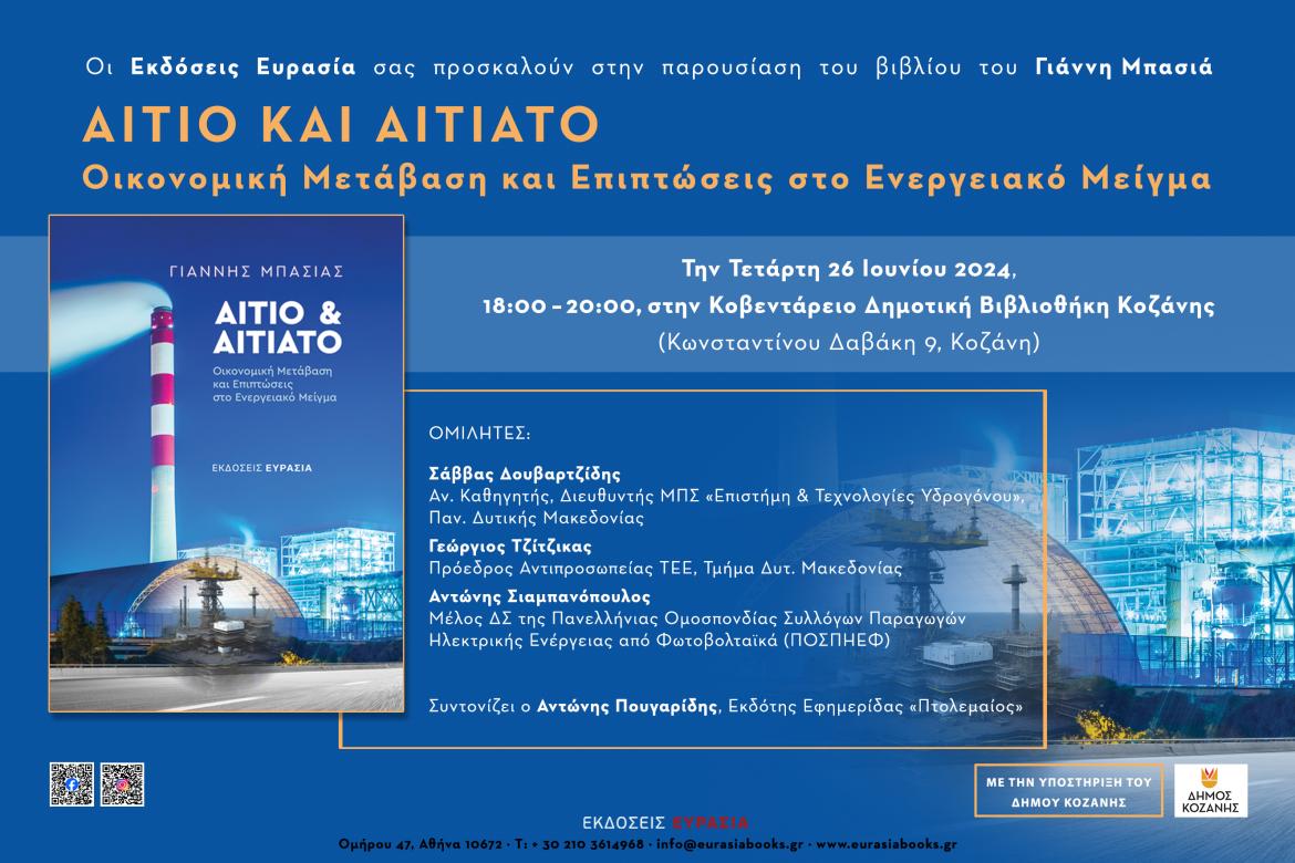 Οι εκδόσεις Ευρασία σας προσκαλούν την Τετάρτη 26 Ιουνίου και ώρα 18:00 – 20:00 στην παρουσίαση του βιβλίου του Γιάννη Μπασιά ΑΙΤΙΟ ΚΑΙ ΑΙΤΙΑΤΟ: Οικονομική Μετάβαση και Επιπτώσεις στο Ενεργειακό Μείγμα.