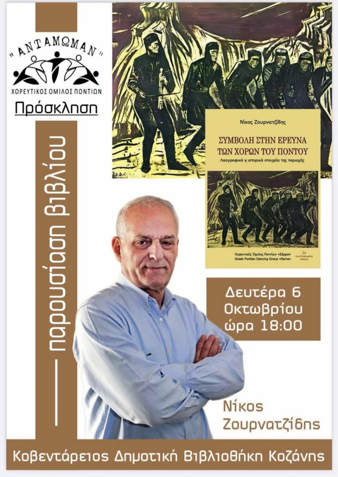 Ο Χορευτικός Όμιλος Ποντίων «Αντάμωμαν» διοργανώνει την παρουσίαση του νέου βιβλίου του Νίκου Ζουρνατζίδη με τίτλο: «Συμβολή στην έρευνα των χορών του Πόντου – Λαογραφικά & ιστορικά στοιχεία της περιοχής». Η εκδήλωση θα πραγματοποιηθεί τη Δευτέρα 6 Οκτωβρίου 2025 και ώρα 18:00, στην Κοβεντάρειο Δημοτική Βιβλιοθήκη Κοζάνης. Το βιβλίο αποτελεί ένα σημαντικό έργο λαογραφικής και ιστορικής τεκμηρίωσης, φωτίζοντας με επιστημονική ακρίβεια και σεβασμό την παράδοση και τον πολιτισμό του Πόντου μέσα από την έρευνα των χορών του. Η παρουσίαση αναμένεται να προσελκύσει ερευνητές, ανθρώπους του πολιτισμού, καθώς και φίλους της ποντιακής παράδοσης. Η είσοδος είναι ελεύθερη. Για περισσότερες πληροφορίες: Χορευτικός Όμιλος Ποντίων «Αντάμωμαν»