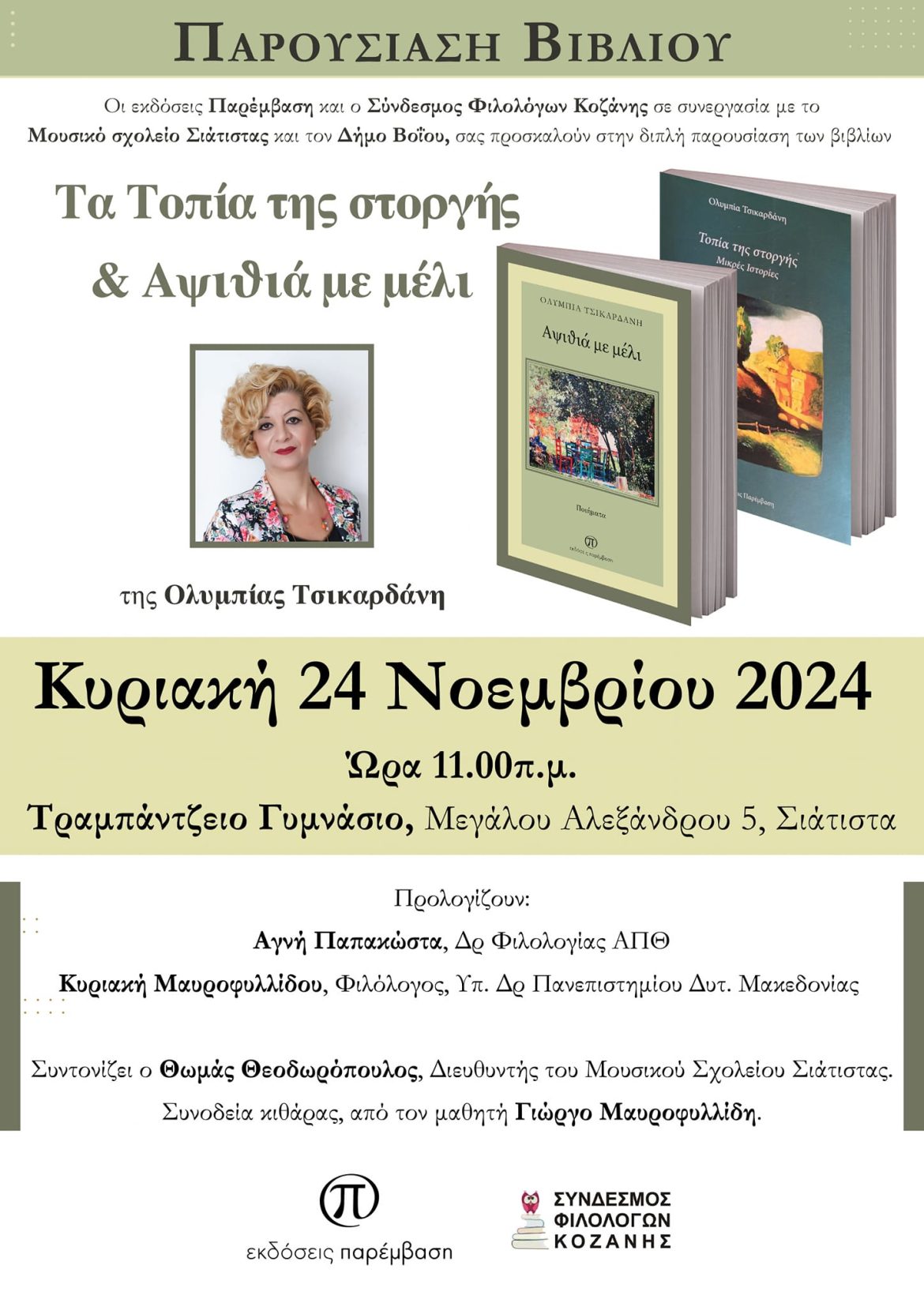 Οι εκδόσεις Παρέμβαση και ο Σύνδεσμος Φιλολόγων, σε συνεργασία με το Μουσικό Σχολείο Σιάτιστας και τον Δήμο Βοΐου, σας προσκαλούν στην διπλή παρουσίαση των βιβλίων μου :