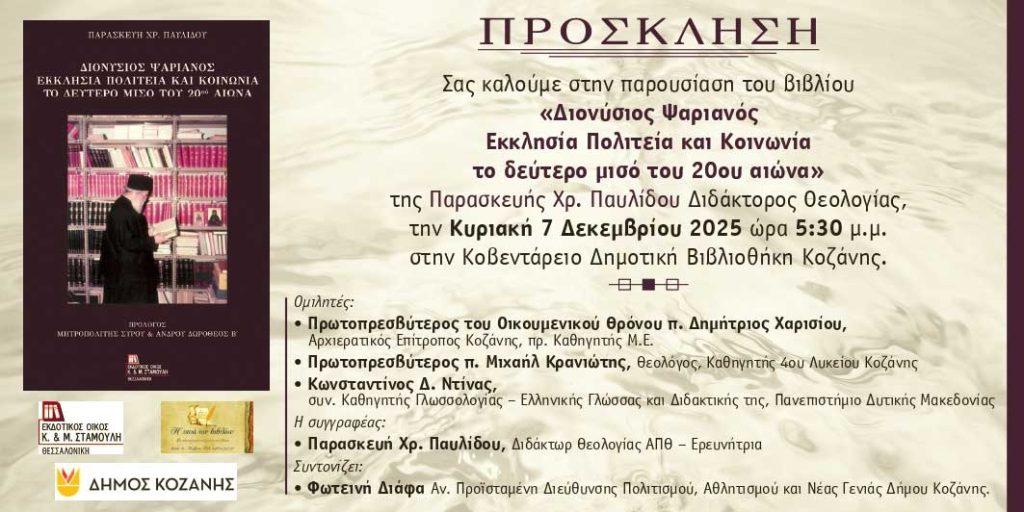 “Διονύσιος Ψαριανός. Εκκλησία Πολιτεία και Κοινωνία το δεύτερο μισό του 20ου αιώνα”. Παρουσίαση βιβλίου