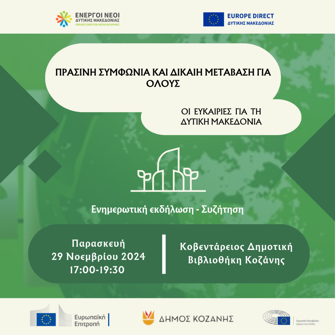 Ο Όμιλος Ενεργών Νέων Δυτικής Μακεδονίας – Europe Direct Δυτικής Μακεδονίας διοργανώνει ανοιχτή συζήτηση με τίτλο “Πράσινη Συμφωνία και Δίκαιη Μετάβαση για όλους – Οι ευκαιρίες για τη Δυτική Μακεδονία” στο πλαίσιο της οποίας θα υλοποιηθούν και διαδραστικά εργαστήρια. Η εκδήλωση θα πραγματοποιηθεί την Παρασκευή 29 Νοεμβρίου 2024, στην Κοβεντάρειο Δημοτική Βιβλιοθήκη Κοζάνης, 17:00-19:00 και θα περιλαμβάνει keynote speech, διαδραστικά εργαστήρια αλλά και τη δυνατότητα ενός δομημένου και δημοκρατικού διαλόγου στην Κοζάνη.