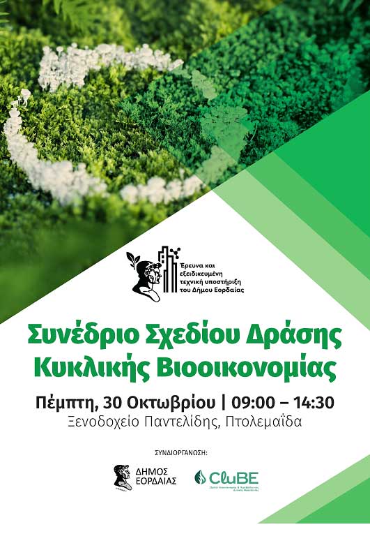 Ο Δήμος Εορδαίας σε συνδιοργάνωση με το Cluster Βιοοικονομίας και Περιβάλλοντος Δυτικής Μακεδονίας (CluBE), σας προσκαλούν να παρακολουθήσετε το Συνέδριο Σχεδίου Δράσης Κυκλικής Βιοοικονομίας του Δήμου Εορδαίας.