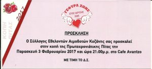 Η διοίκηση του Συλλόγου Εθελοντών Αιμοδοτών Κοζάνης «Γέφυρα Ζωής» καλεί τα μέλη και τους φίλους του στην καθιερωμένη κοπή της Βασιλόπιτας, τη Παρασκευή 3 Φεβρουαρίου 2017 στις 21:00, στο Café Avantzo, Ανδρέα Παπανδέου 27, τηλ. 2461029520.