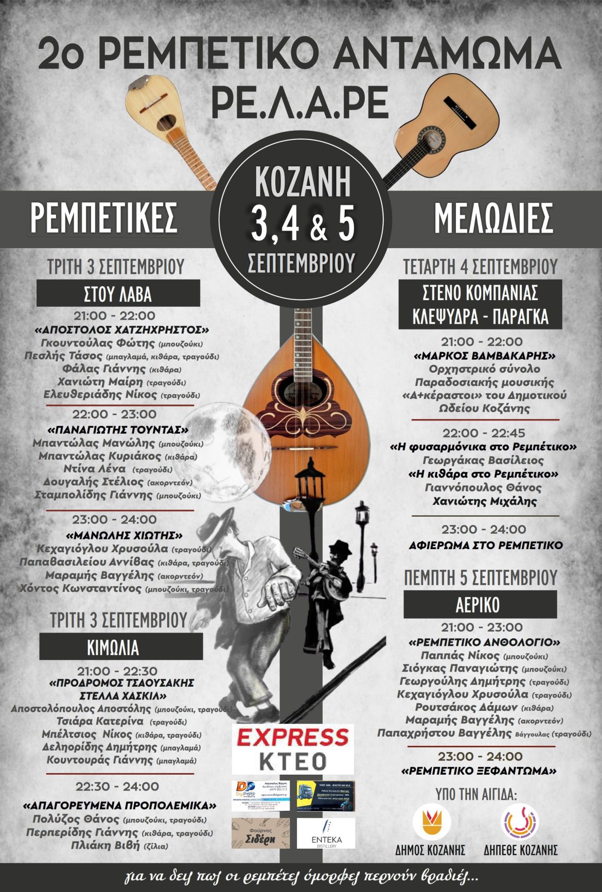 Ο Σύλλογος φίλων μουσικής Κοζάνης ΡΕ.Λ.Α.ΡΕ. διοργανώνει για 2η συνεχόμενη χρονιά το Ρεμπέτικο Αντάμωμα – Φεστιβάλ στην πόλη της Κοζάνης, από 3 εώς 5 Σεπτεμβρίου. Μια ευκαιρία για όλους μας να γνωρίσουμε καλύτερα τις ρίζες του Λαϊκού μας τραγουδιού, να τραγουδήσουμε αγαπημένα τραγούδια αλλά και να ανακαλύψουμε κρυμμένους θησαυρούς της Πολιτιστικής μας κληρονομιάς.