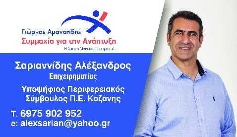 Σαριαννίδης Αλέξανδρος. Υποψήφιος Περιφερειακός Σύμβουλος ΠΕ Κοζάνης. Γιώργος Αμανατίδης “Συμμαχία για την ανάπτυξη”