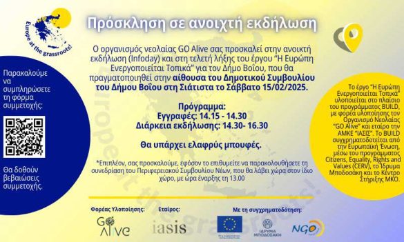 Το σχέδιο «Η Ευρώπη ενεργοποιείται τοπικά» υλοποιείται στο πλαίσιο του προγράμματος BUILD, με φορέα υλοποίησης την ‘’GO Alive’’, και εταίρο την ΑμΚΕ ΙΑΣΙΣ. Το BUILD συγχρηματοδοτείται από την Ευρωπαϊκή Ένωση, μέσω του προγράμματος Citizens, Equality, Rights and Values (CERV), το Ίδρυμα Μποδοσάκη και το Κέντρο Στήριξης ΜΚΟ Κύπρου. Το γενικότερο σχέδιο περιλαμβάνει την σύσταση ενός Περιφερειακού Συμβουλίου Νέων που αποτελείται από 20 νεαρά άτομα των 5 συμμετεχόντων δήμων και την εκπαίδευση αυτών στις αξίες της Ε.Ε. προάγοντας τη ενεργή συμμετοχή τους στις δημοκρατικές διαδικασίες.
