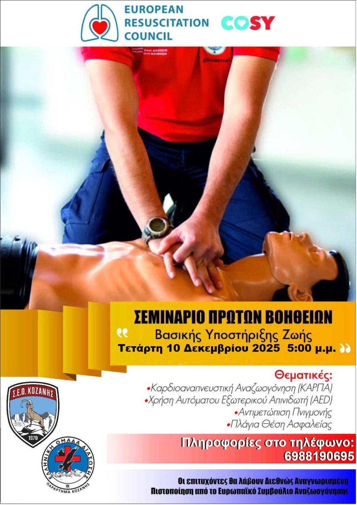 Σημαντικό Πιστοποιημένο Σεμινάριο Βασικής Υποστήριξης Ζωής από τον Σ.Ε.Ο. ΚΟΖΑΝΗΣ και την Ελληνική Ομάδα Διάσωσης Κοζάνης