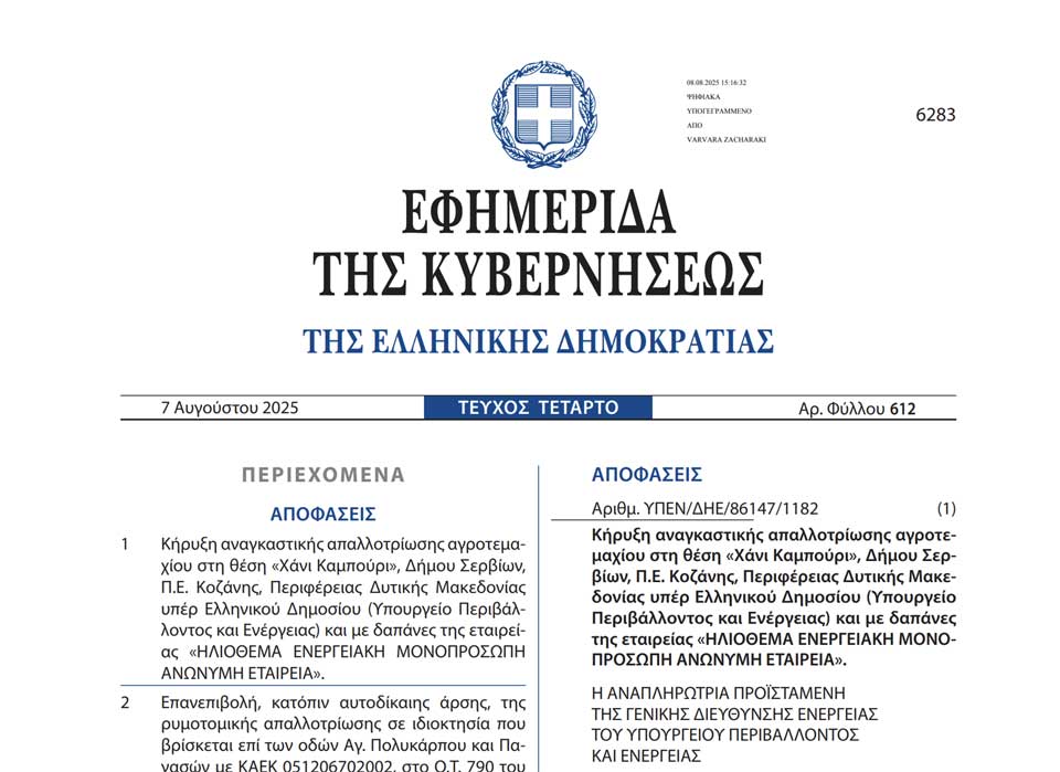 Κόντρα στην ομόφωνη αρνητική θέση του Δημοτικού Συμβουλίου Σερβίων (όπως αποτυπώθηκε στην με αριθμ. 48/2025 απόφασή του, ΑΔΑ:6ΗΗΗ46ΜΓΗ5-ΧΧΙ) αλλά και στην αρνητική θέση της τοπικής κοινωνίας, εκδόθηκε από το αρμόδιο Υπουργείο Περιβάλλοντος και Ενέργειας απόφαση απαλλοτρίωσης δημοτικής δασικής έκτασης, στη θέση «Χάνι Καμπούρι» της Δ.Κ. Καστανιάς του Δήμου Σερβίων (Αριθμ. ΥΠΕΝ/ΔΗΕ/86147/1182, ΦΕΚ612/Δ/07.08.25), υπέρ της εταιρείας «ΗΛΙΟΘΕΜΑ ΕΝΕΡΓΕΙΑΚΗ Μ.Α.Ε.».