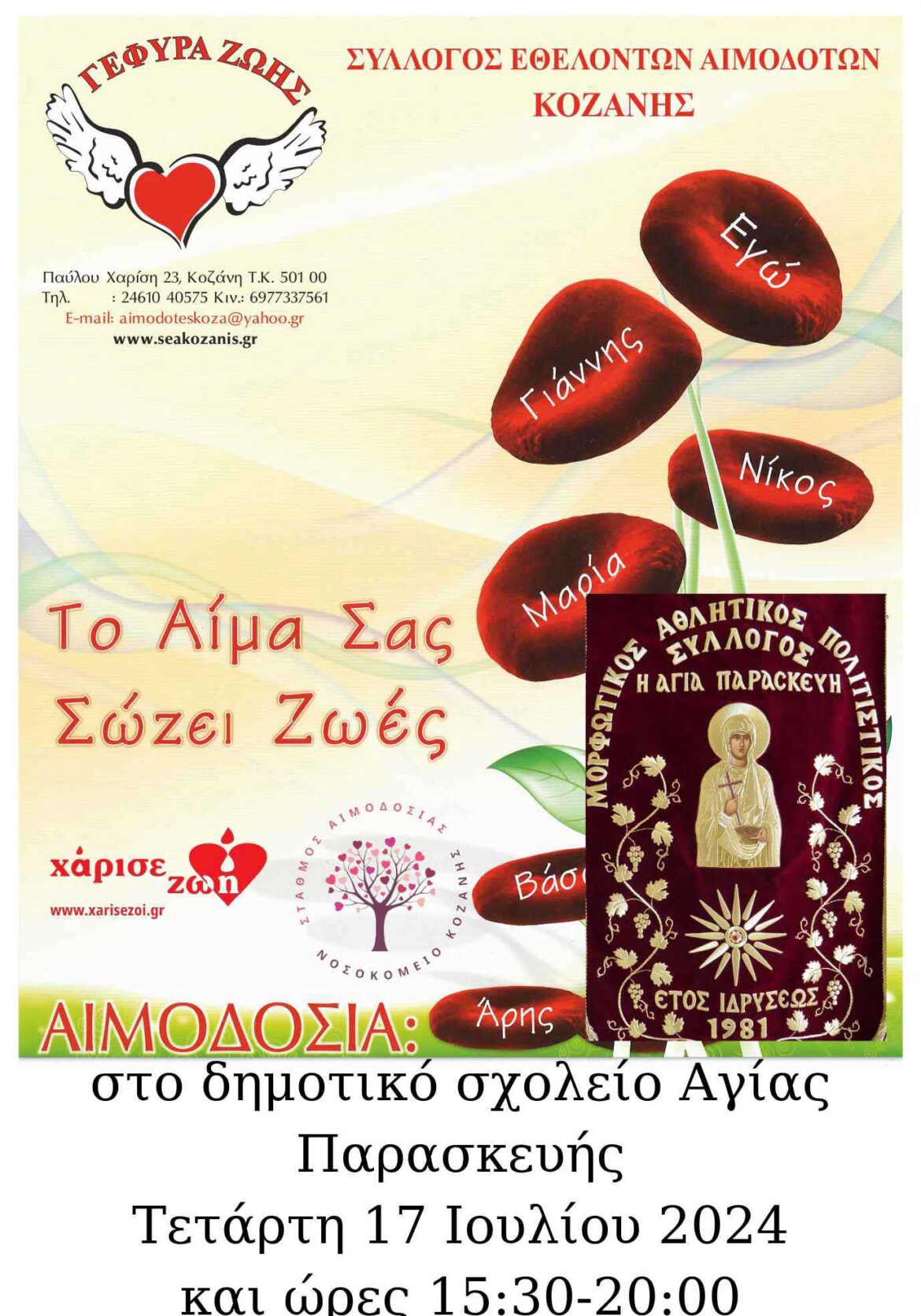 στο Δημοτικό Σχολείο του Δ.Δ Αγίας Παρασκευής, διοργανώνεται η 23η Αιμοδοσία του ΣΕΑ Κοζάνης με τον Πολιτιστικό Σύλλογο και το Τοπικό Συμβούλιο Αγίας Παρασκευής , σε συνεργασία με το τμήμα Αιμοδοσίας του «Μαμάτσειου» Γενικού Νοσοκομείου Κοζάνης.