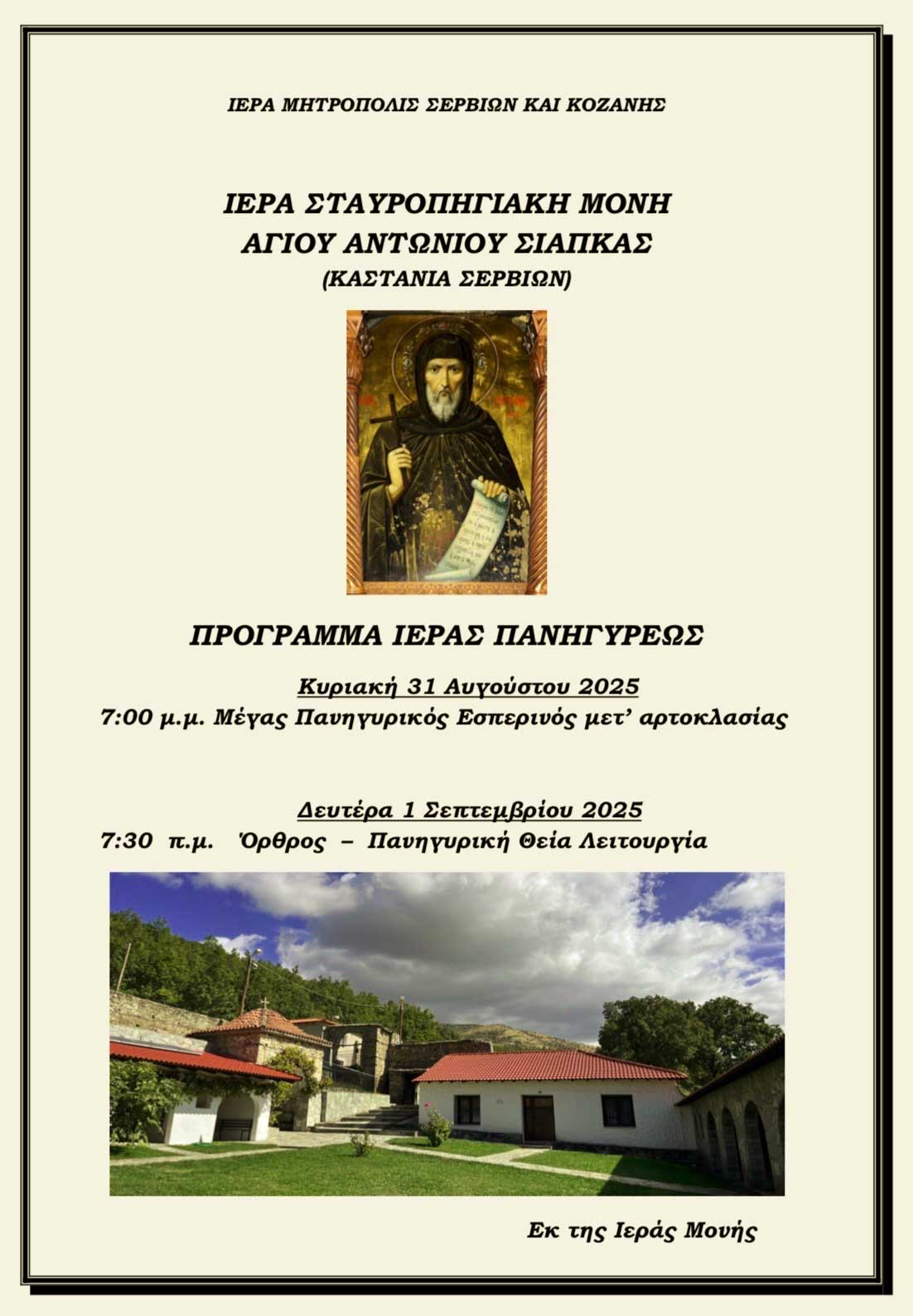 Φέρεται εις γνώσιν των ευσεβών χριστιανών και προσκυνητών ότι πανηγυρίζει η Ιερά Μονή Αγίου Αντωνίου Σιάπκας την Κυριακή 31/08/2025 και την Δευτέρα 01/09/2025.