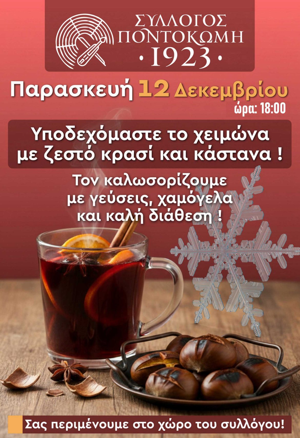 Σύλλογος «Ποντοκώμη 1923»: Αναβάλλεται λόγω καιρού η εκδήλωση του Σάββατο 6 Δεκεμβρίου – Νέα ημερομηνία η Παρασκευή 12 Δεκεμβρίου 2025 και ώρα 18:00